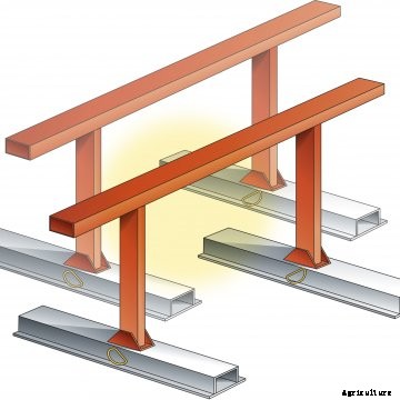 私の4×6フィートの牛の警備員は、フェンスラインの2つの枕木に座っています。これは、8インチ間隔の1½インチの井戸パイプから構築されています。井戸パイプは3×3インチの山形鋼に溶接されています。パイプに溶接されているのは4つのランプ(それぞれが10×12インチ)であり、 5