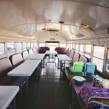 マーティは、スクールバスを使って乗組員に食事を届けている別の農場について聞いていました。 「私はそのアイデアですぐに売られました、 「カイルは言います。「この過去の冬の間、 リンスケはオンラインで中古バスを検索することでボールを転がしました。」やがて、 Metzgersは、2005年に廃止された72人乗りのスクールバスの所有者でした。