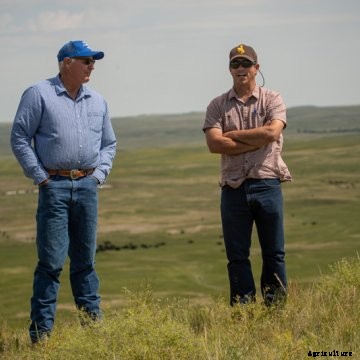 ボブ・リットバーガー(青いシャツ)は、なだらかな丘の谷を見下ろします。 松の木、 とプレーリーグラス。コヨーテは遠くにイップスします。 「バッファローがここを旅したとき、 それは最高の状態で回転放牧でした、 」と彼は言います。 「彼らのためのフェンスはありませんでした。ここで、家畜が1か所に長く留まらないようにする必要があります。草を改善するために、常に動き回っています。それは、水牛がここにいたときの様子を再現しています。」