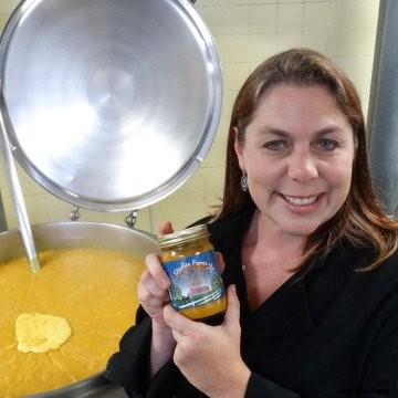 Kuemerleのレシピはすべて、40ガロンを満たすのに十分な大きさのバッチを作成するために乗算する前に、彼女が完成させる小バッチレシピとして始まります。 ウォータージャケット、 彼女が缶詰にするガス式のやかん。カップルは、配管の熱い製品をフィラーに移すために、底に栓が付いた2つの使用済みやかんを購入しました。彼女の成分の高いpHと高温(200°F以上)のために、 彼女は追加の処理を必要としません。